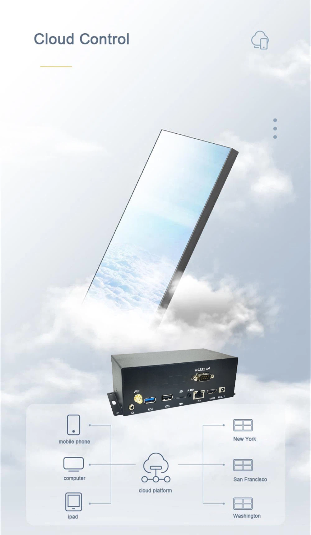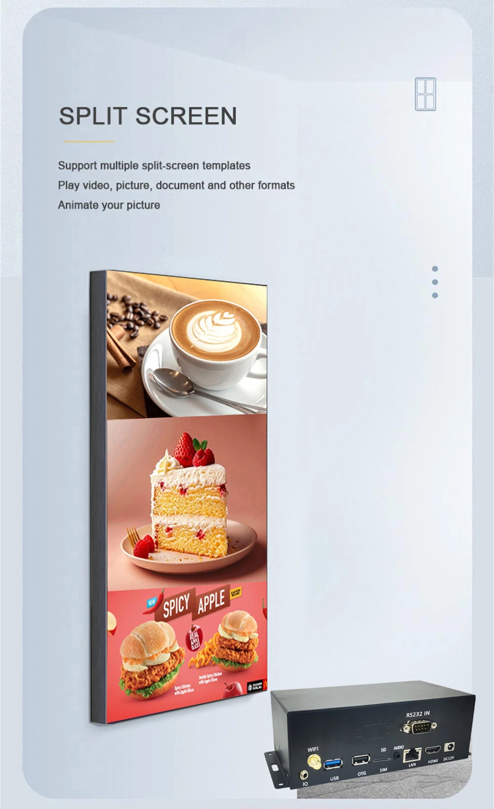 Horizontal and vertical screen playback. Split-screen display. Auto loop play after powering on. Timing switcher. Update firmware by network or USB. Built in 4G module(Cat.7), GPS module |