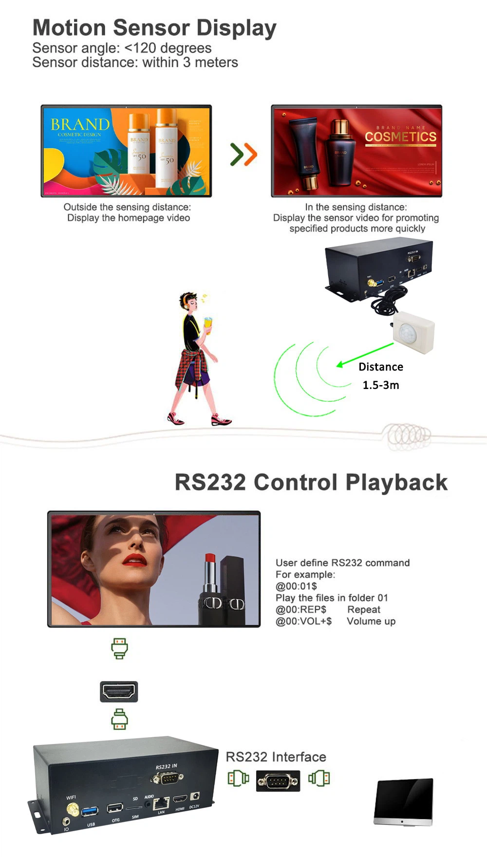 Auto-play when powered on. Play content in the folder. RS232 control playback. Custom control playback. Custom sound output mode: Audio, Optical, HDMI |