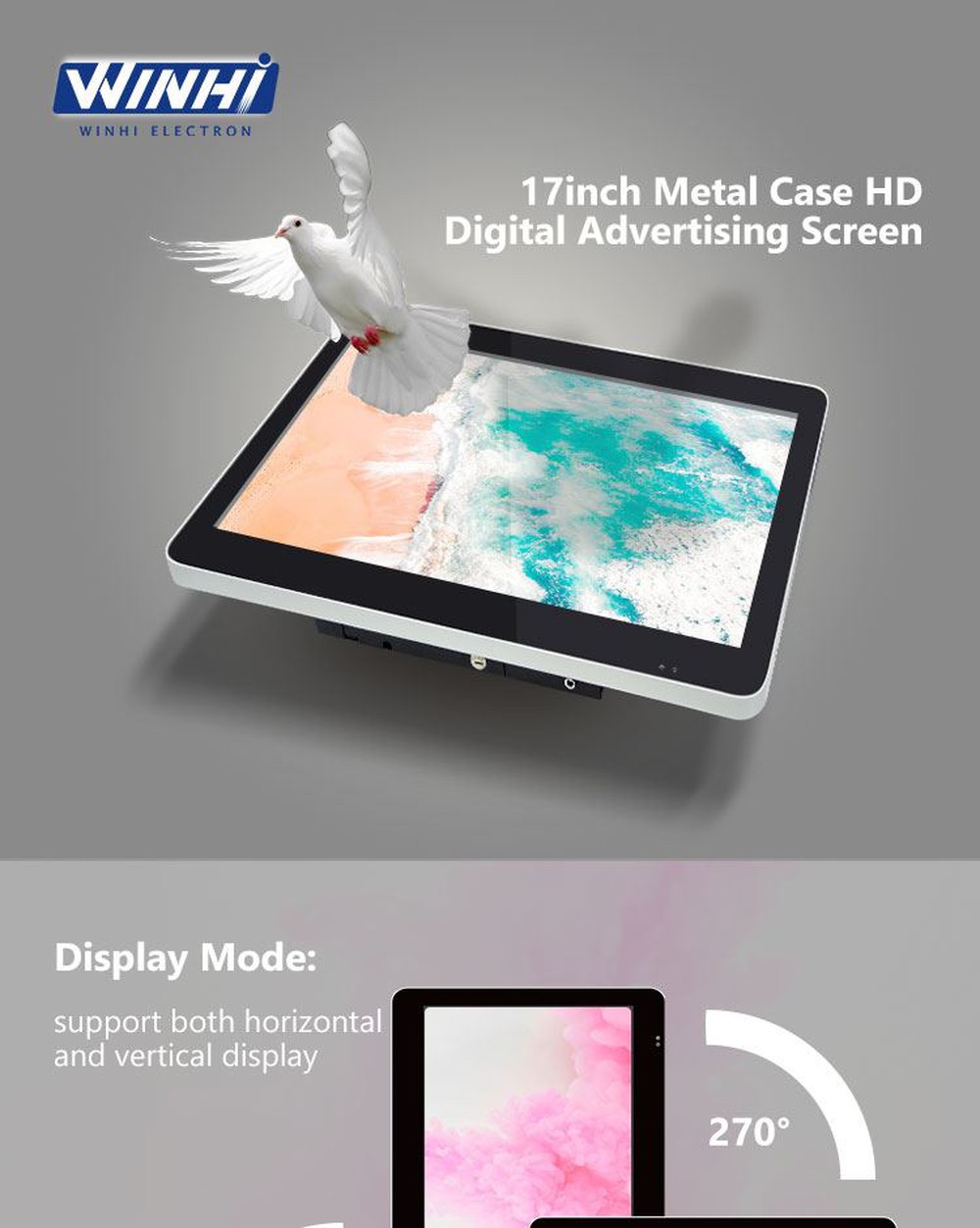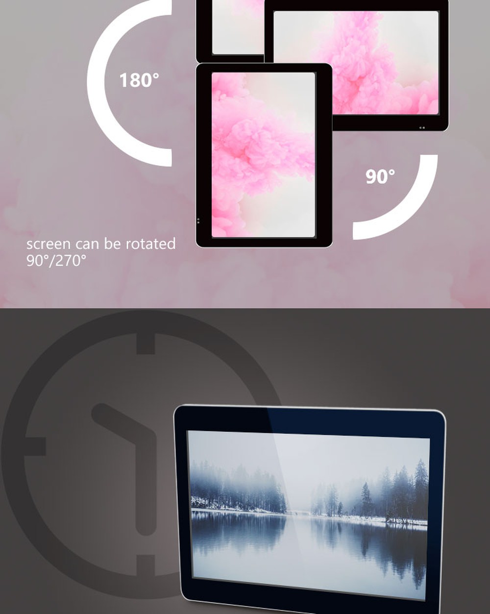 | Display Mode: supports both horizontal and vertical display, and the screen can be rotated 90°/270°. |