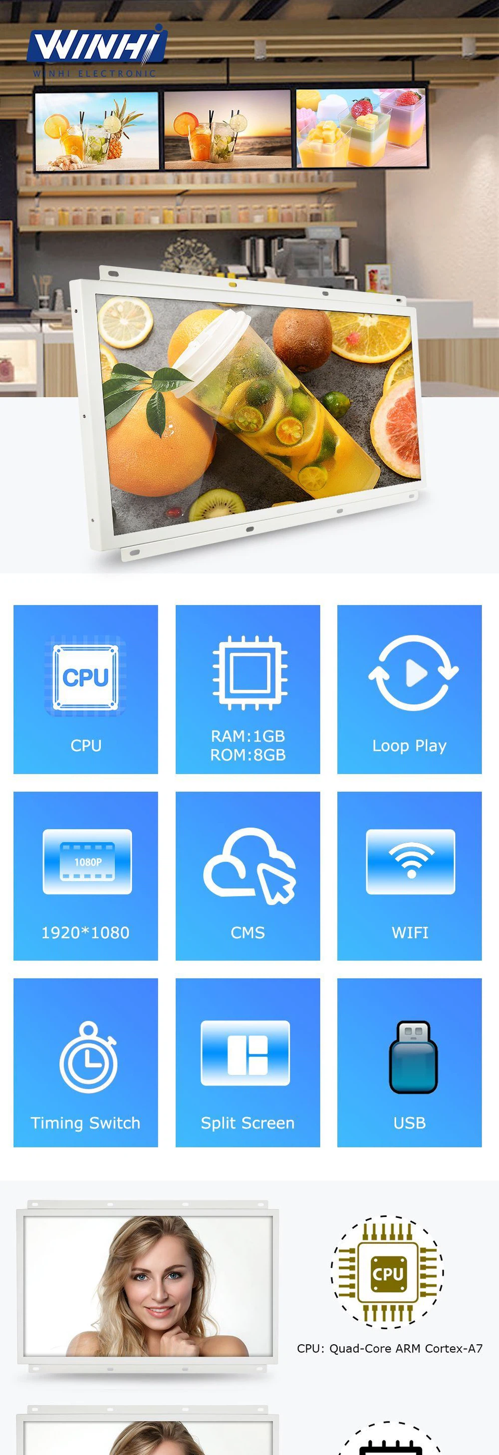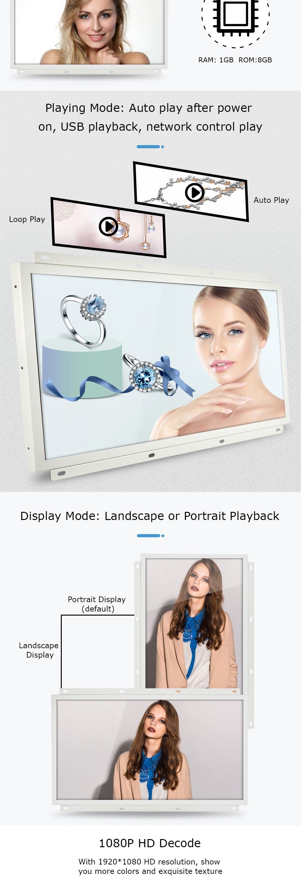 Mounting method: the advertising player supports embedded horizontal and wall-mounted vertical. |