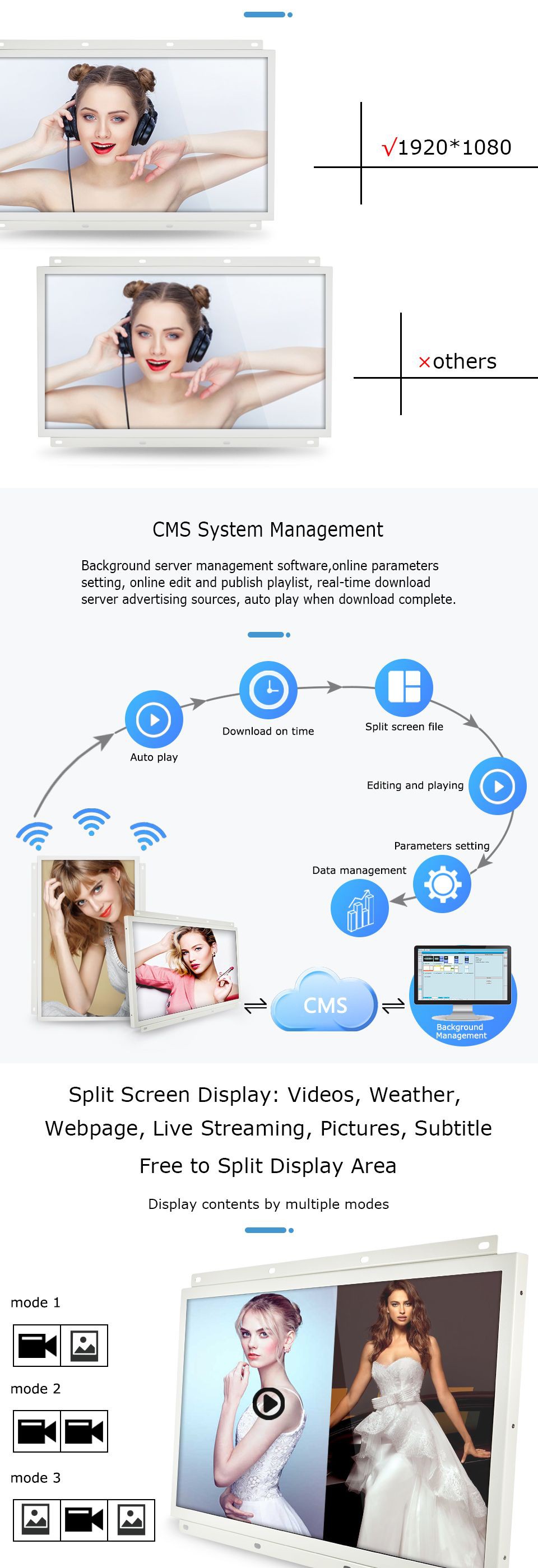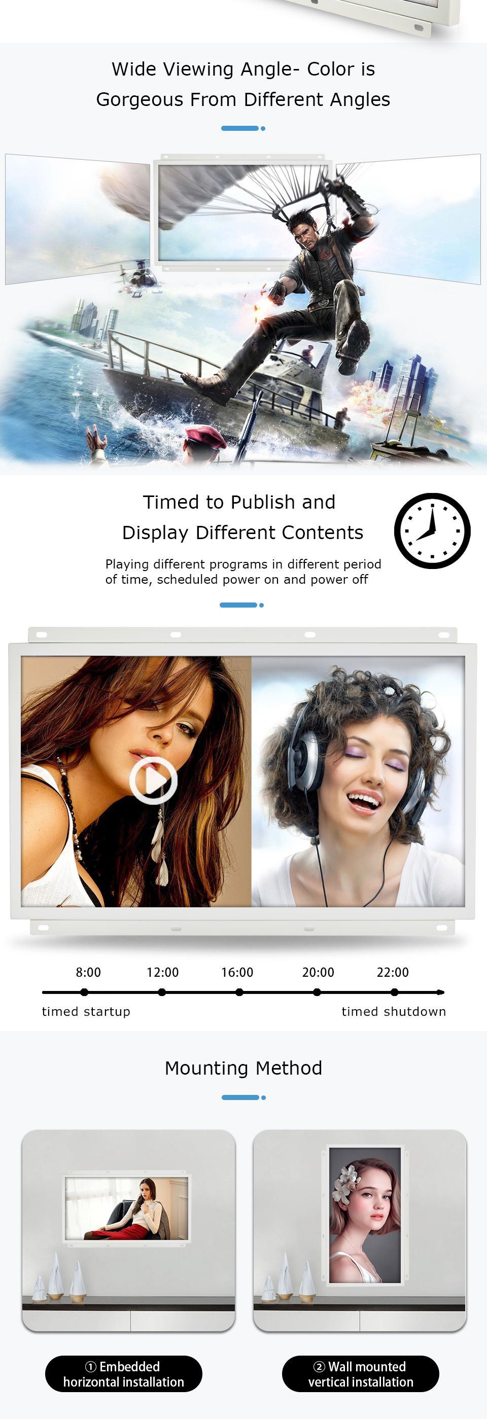 | The 15.6-inch video display ads are the latest product that launched in August 2021. It is designed with a metal case and open frame, suitable for indoor shelf installation, wall-mounted installation, embedded installation, desktop installation, etc. |
